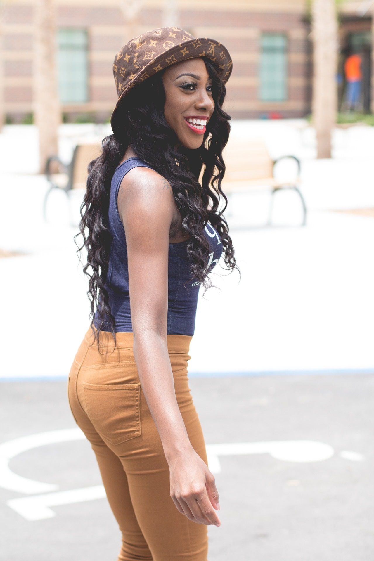 African American Black Woman in LV Hat Blue Tank Top
